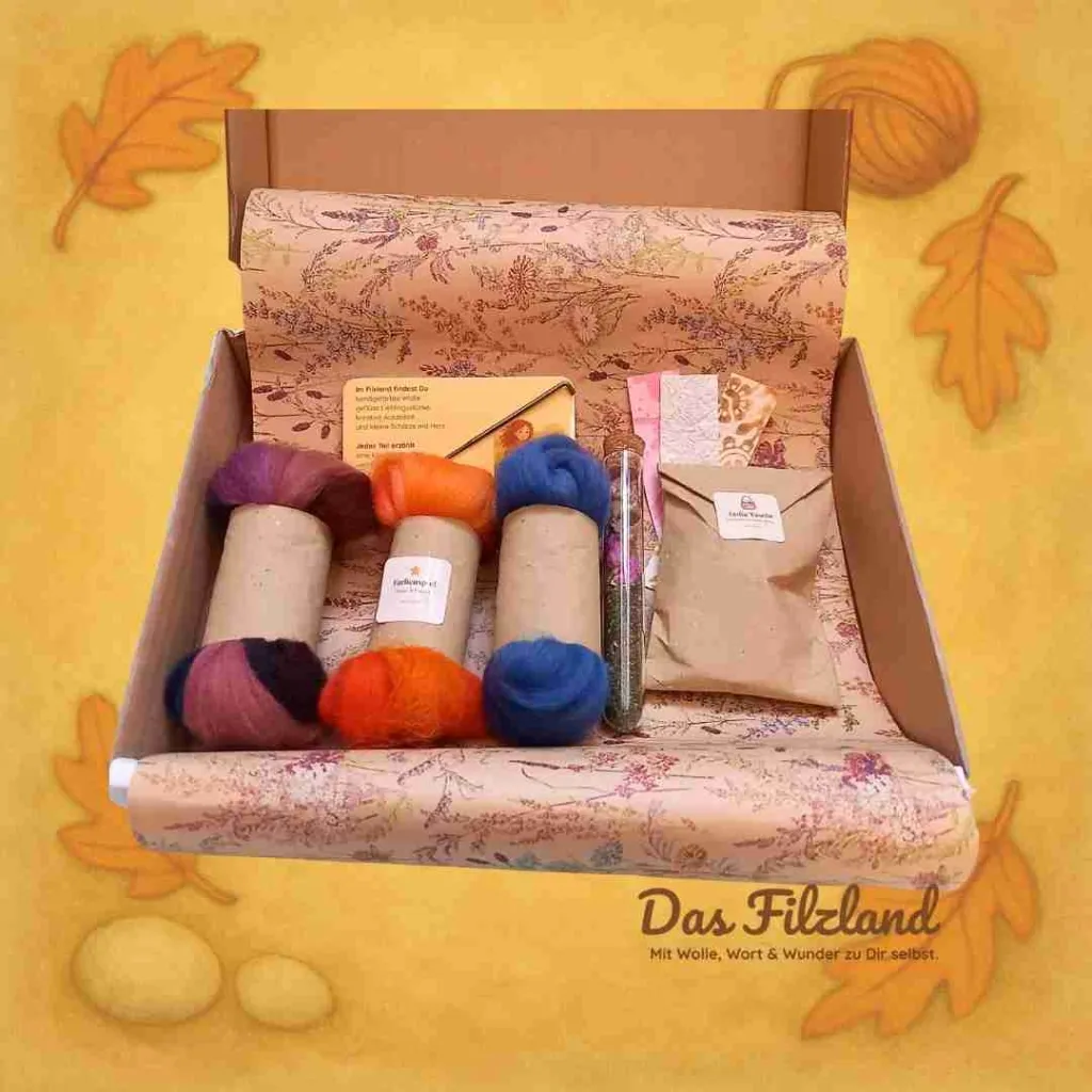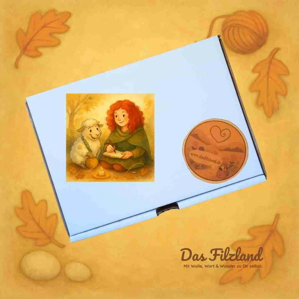Die Farben der Wolle sind inspiriert vom Herbst – Gold, Moosgrün, Beere, Rost – und lassen sich harmonisch mit dem feinen Chiffontuch verbinden. Dazu kommen kleine Extras wie ein Wunschzettel zum Einfilzen, ein Teebeutel für Deinen Wohlfühlmoment und ein Zitat von Wolly (der übrigens behauptet, er hätte die Box selbst gepackt … mit den Hufen, versteht sich).